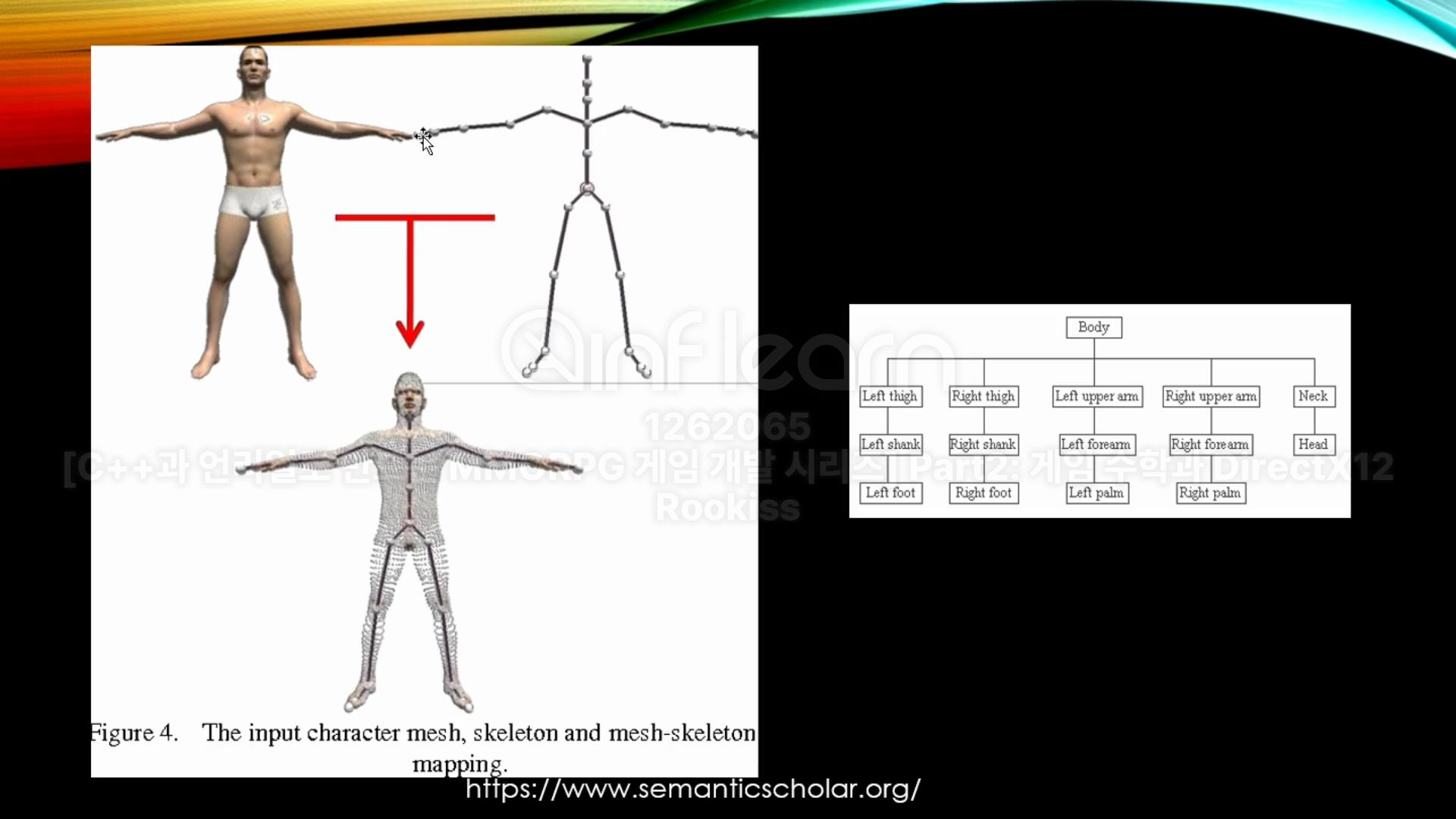 - Skinning은 정점 단위의 이동 대신 객체 내부에 뼈대(Skeleton)를 배치하여 관절 단위로 움직이는 방식을 사용합니다.